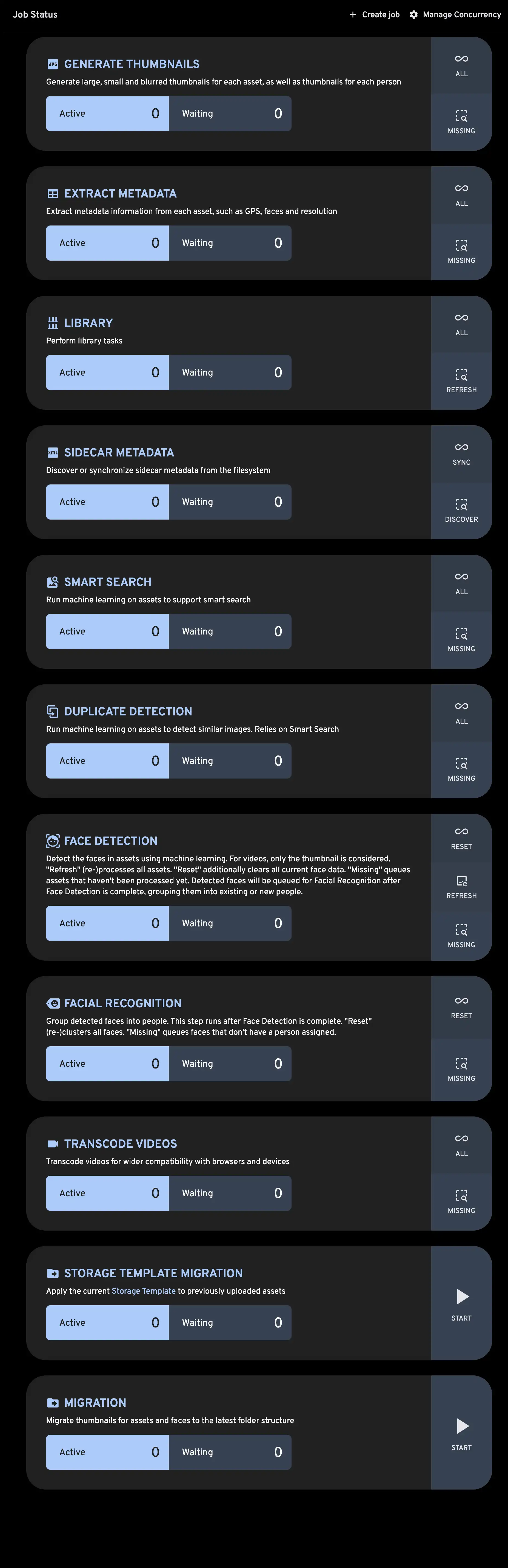 When a new asset is uploaded it kicks off a series of jobs, which include metadata extraction, thumbnail generation, machine learning tasks, and storage template migration, if enabled. To view the status of a job navigate to the Administration -> Jobs page.