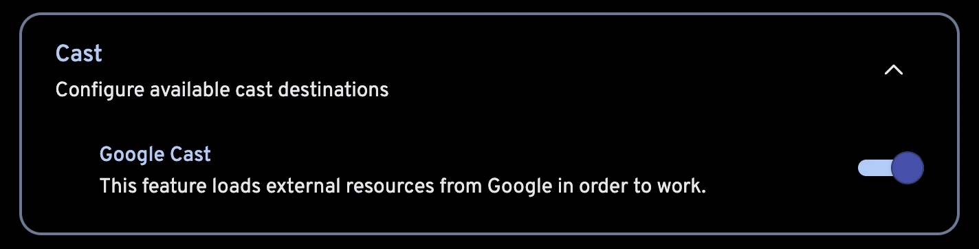 Google Cast support is disabled by default. The web UI uses Google-provided scripts and must retrieve them from Google servers when the page loads. This is a privacy concern for some and is thus opt-in.